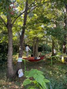ひたすらどんぐりを竹のレールに転がす子、3メートルもの高さの木に登る子、木の上に張ったモンキーブリッジに捕まりながら「紫の実があった!と教えてくれる子、朽木を砕いて出てきた幼虫に夢中な子、ハンモックに寝転んで空を眺めている子、などなど。「森で遊ぶ日」まずまずでした。
