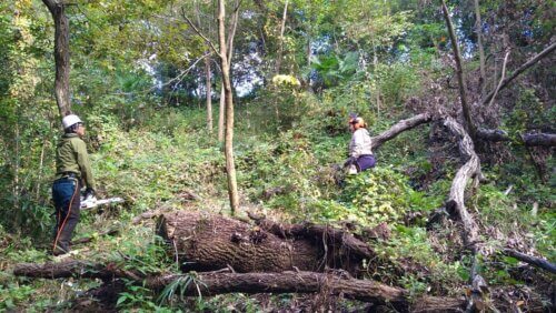 また、今回は、NPO法人国際自然大学校から二人のの強力な助っ人が、チェーンソウと草払い機持参で来てくれましたので、木漏れ日広場の倒木を運びやすい大きさの丸太に切ってもらいました。助かる~💛どんぐり広場でササを刈りながら、聞こえてくるチェーンソウの音に、山の中で作業しているような感覚になったりして。